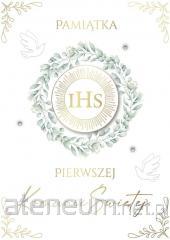 Pudełko Pamiątkowe z okazji Komunii Świętej o wymiarach 245x135x20mm. Zawiera karnet okolicznościowy DL z życzeniami, całość stanowi komplet graficzny z pudełkiem. Produkt wysokiej jakości uszlachetniony złotem.