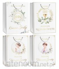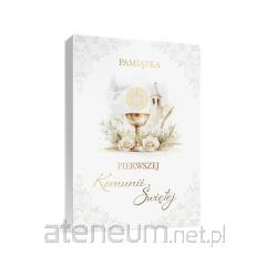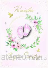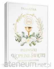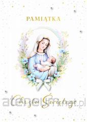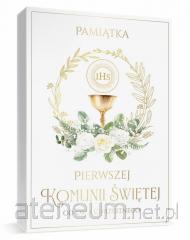 Książeczka z Okazji I Komunii Świętej w formacie A5 wraz z kopertą w środku.