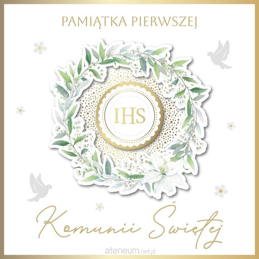Książeczka z Okazji I Komunii Świętej w formacie A5 wraz z kopertą w środku.