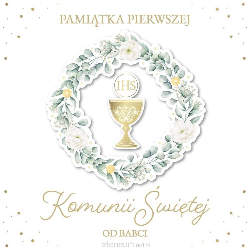 Książeczka z Okazji I Komunii Świętej w formacie A5 wraz z kopertą w środku.