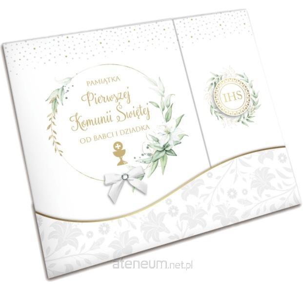 Książeczka z okazji I Komunii Świętej w formacie A4 wraz z kopertą w środku.