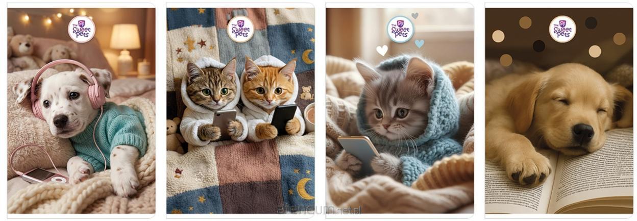 Zeszyt A5 z zadrukiem kratka, który idealnie sprawdzi się jako niezbędne narzędzie w szkole.\nZestawienie kompaktowego formatu A5 z liczbą kartek wynoszącą 60 zapewnia odpowiednią przestrzeń do zapisywania notatek, wykonywania szkiców czy rozwiązywania zadań.\nZeszyt wykonany został z wysokiej jakości papieru o gramaturze 70g, co gwarantuje trwałość i wygodę pisania.\n Dodatkowo, środek zeszytu został zadrukowany kratką, co ułatwia organizację notatek oraz czytelność zapisanych treści.\nOkładka zeszytu została specjalnie pokryta matowym lakierem UV, który nie tylko nadaje mu elegancki wygląd, ale także chroni przed zabrudzeniami i uszkodzeniami.\n Dodatkowym atutem są zaokrąglone rogi, które zapewniają komfort podczas użytkowania.\nOprawa zeszytu jest miękka, co daje możliwość swobodnego przeglądania kartek oraz składania zeszytu w dowolny sposób. Dzięki temu zeszyt idealnie dopasuje się do każdej potrzeby. idealny do szkolnych notatek i zadań\n praktyczny i wygodny w użytkowaniu\n wzór The Sweet Pets\n format A5, 60 kartek w kratkę\n grubość kartek 70g\n liniatura niebieska, margines czerwony\n okładka miękka\n uszlachetnienie: lakier UV matowy\n wewnętrzna okładka bez nadruku\n etykieta do wpisania danych na okładce: brak\n trwałe materiały i solidne wykonanie\n zaokrąglone rogi