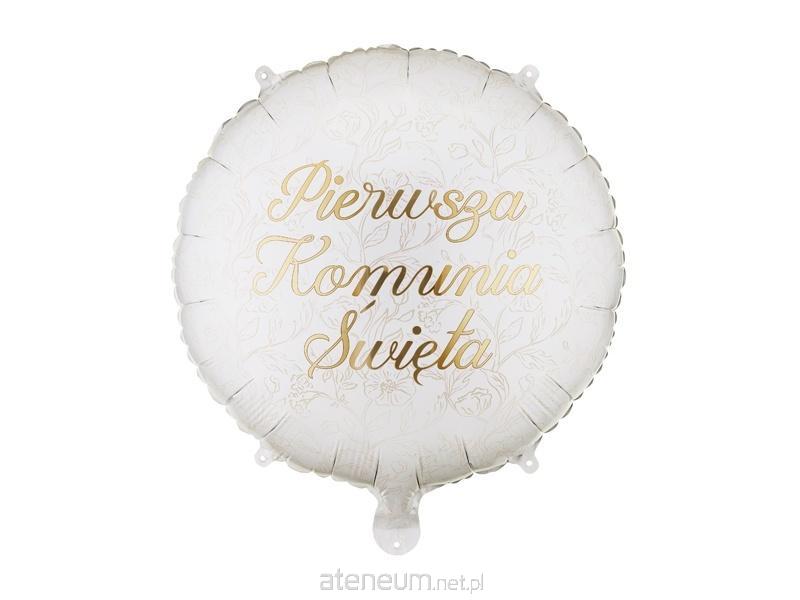 Balon foliowy pastylka \\'\\'Pierwsza komunia święta\\'\\', w kolorze białym ze złotym napisem i beżowymi kwiatami. Wymiary przed napompowaniem ok. 45 x 45 cm (18 x 18\\'\\'), wymiary po napompowaniu ok. 35 x 35 cm (14 x 14\\'\\'). Do napompowania powietrzem i helem. Zestaw zawiera słomkę.