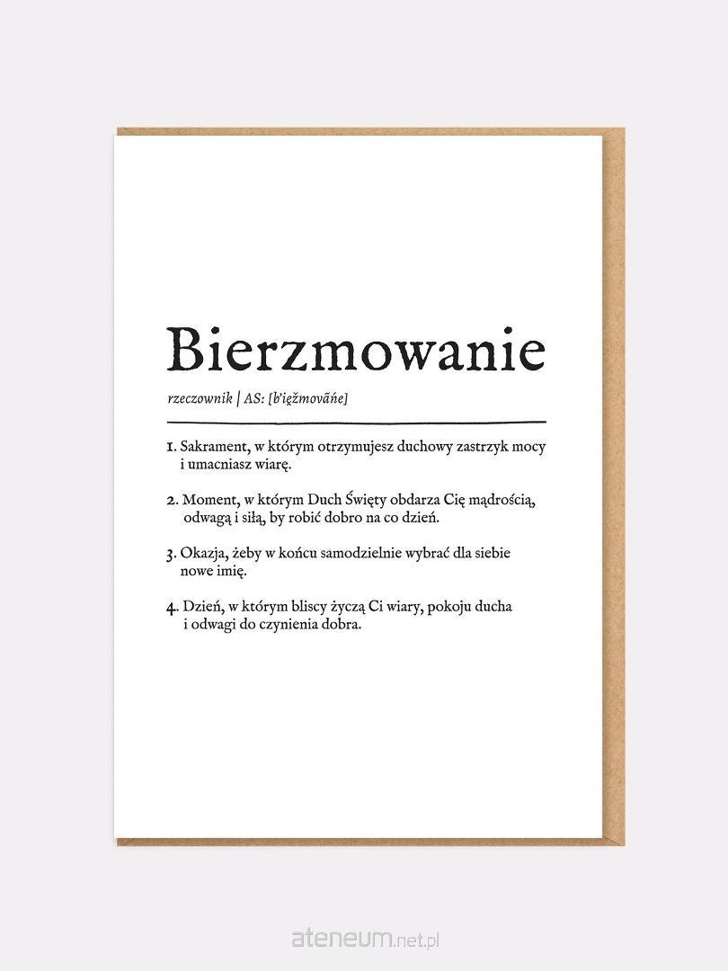Typograficzna forma inspirowana hasłem słownikowym nadaje jej nowoczesny charakter. To minimalistyczna kartka okolicznościowa na bierzmowanie, która zamiast rozbudowanych symboli stawia na słowo i sens. Dzięki temu sprawdzi się zarówno jako elegancka pamiątka, jak i subtelny dodatek do prezentu.