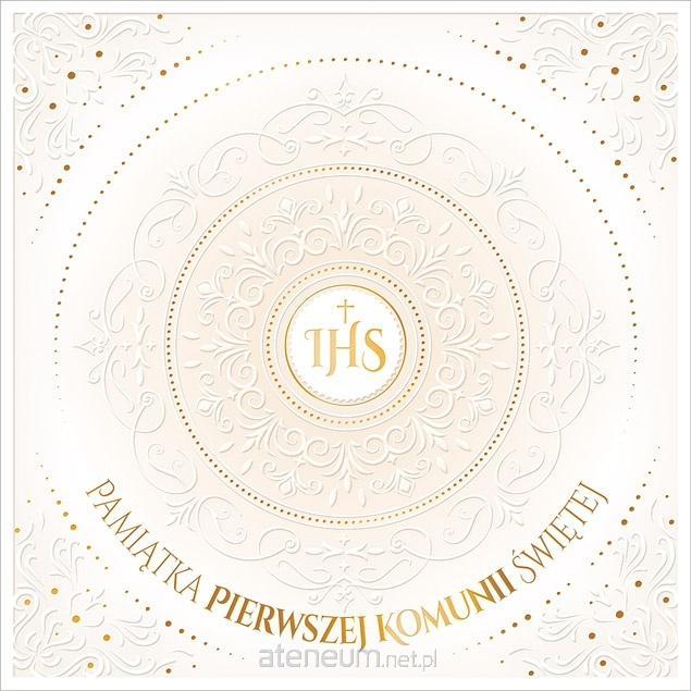 Karnet komunijny, złocony i tłoczony, tekst życzeń w środku.