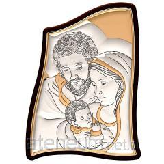 Srebrny Obrazek Święta Rodzina na Drewnie z Podstawką - Zdobiony Złoceniami, Prostokątny 15x10,5 cm.