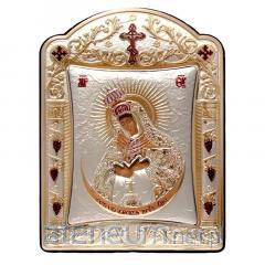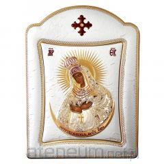 Wprowadź do swojego domu atmosferę duchowej harmonii i artystycznego piękna dzięki temu wyjątkowemu srebrnemu obrazkowi przedstawiającemu Matkę Bożą z Dzieciątkiem. Ten niezwykły wizerunek, o wymiarach około 25,5x18 cm, wyróżnia się nieregularnym kształtem i misternym wykonaniem w szlachetnym srebrze.