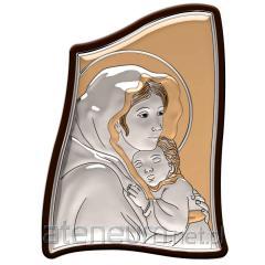 Srebrny Obrazek Matka Boża z Dzieciątkiem na Drewnie - Złote Akcenty, 25,5x18 cm, Z Podstawką.
