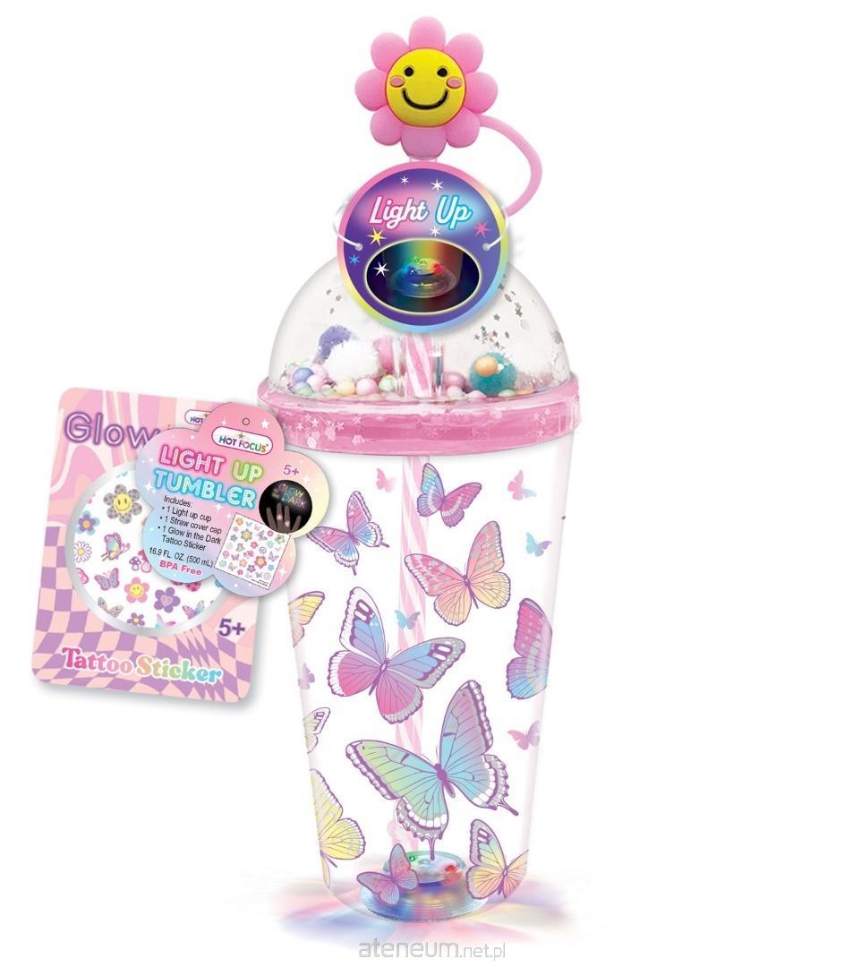 Kubek o pojemności 500ml wykonany z grubego plastiku. Zakręcany wypukłą nakrętką dzięki czemu napój się z niego nie wyleje. Pod kopułą nakrętki znajdują się kolorowe kuleczki dla dodatkowego dekoracyjnego efektu. Do kubka dołączona jest wielorazowa słomka oraz arkusz mini - tatuaży świecących w ciemności. Słomkę można zamknąć silikonową zatyczką dla większej higieny. W denku kubka wbudowane są kolorowe światełka uruchamiane przyciskiem. Wiek: 5+.