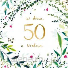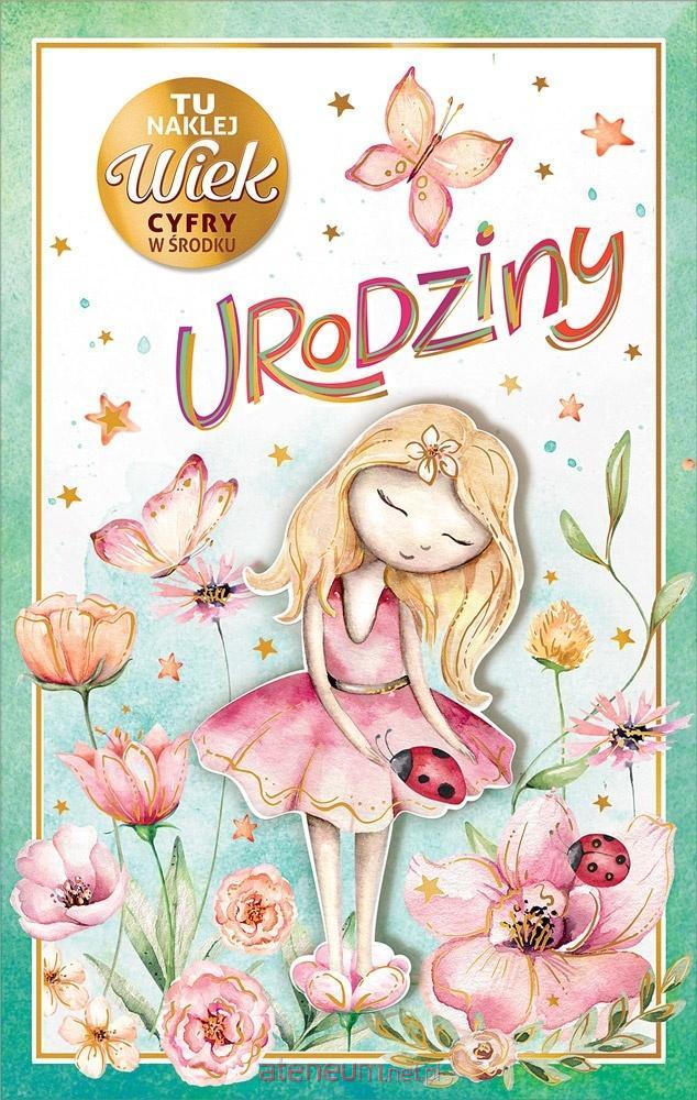 Karnet urodzinowy z życzeniami w środku, złocenie, naklejane elementy oraz naklejki z cyframi do personalizacji wieku