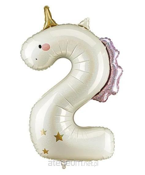 Balon foliowy Cyfra 2 - Jednorożec w kolorze kremowym z holograficznym efektem, ozdobiony jasnoróżowymi i złotymi detalami. Rozmiar przed napompowaniem ok. 118 cm (46,5''), rozmiar po napompowaniu ok. 93 cm (36,5''). Do napompowania powietrzem i helem. Zestaw zawiera słomkę. Balon jest samouszczelniający się.