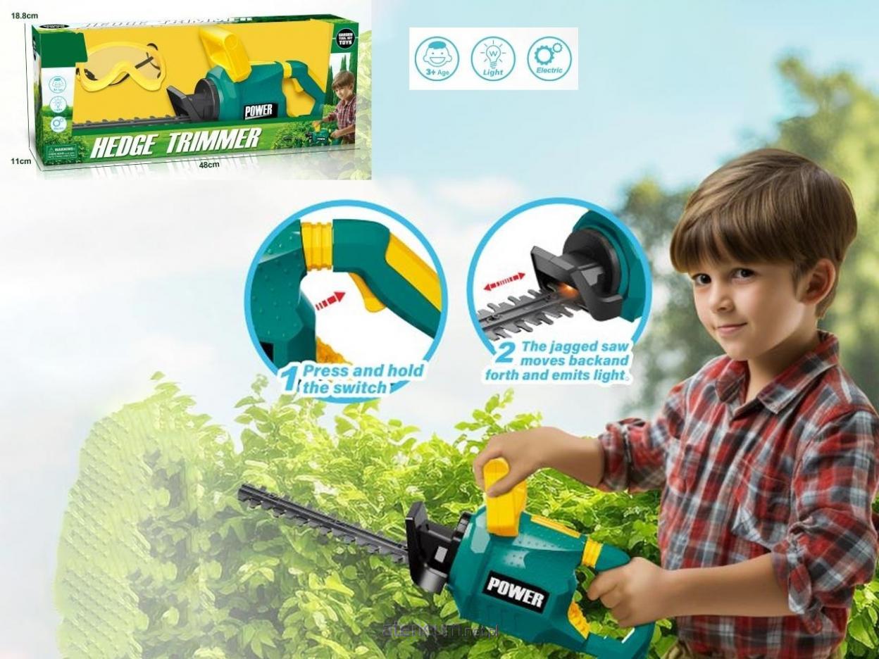 Realistyczne nożyce do żywopłotu dla małego ogrodnika! Zabawka została wyposażona w ruchome ostrze, które porusza się przód-tył po naciśnięciu przycisku, oraz efekt świetlny LED imitujący prawdziwe urządzenie ogrodowe. To doskonała propozycja dla dzieci, które lubią naśladować dorosłych podczas prac w ogrodzie. Ergonomiczny uchwyt oraz lekka konstrukcja sprawiają, że zabawka jest wygodna i bezpieczna w użytkowaniu. Idealna do zabawy w ogrodnika i rozwijania wyobraźni. Najważniejsze cechy: ruchome ostrze (bezpieczna imitacja); efekt świetlny LED; realistyczny wygląd; zasilanie bateryjne. dla dzieci 3+. Wymiary opakowania: 48 18,8 11 cm. Świetny pomysł na prezent dla małego pomocnika w ogrodzie.