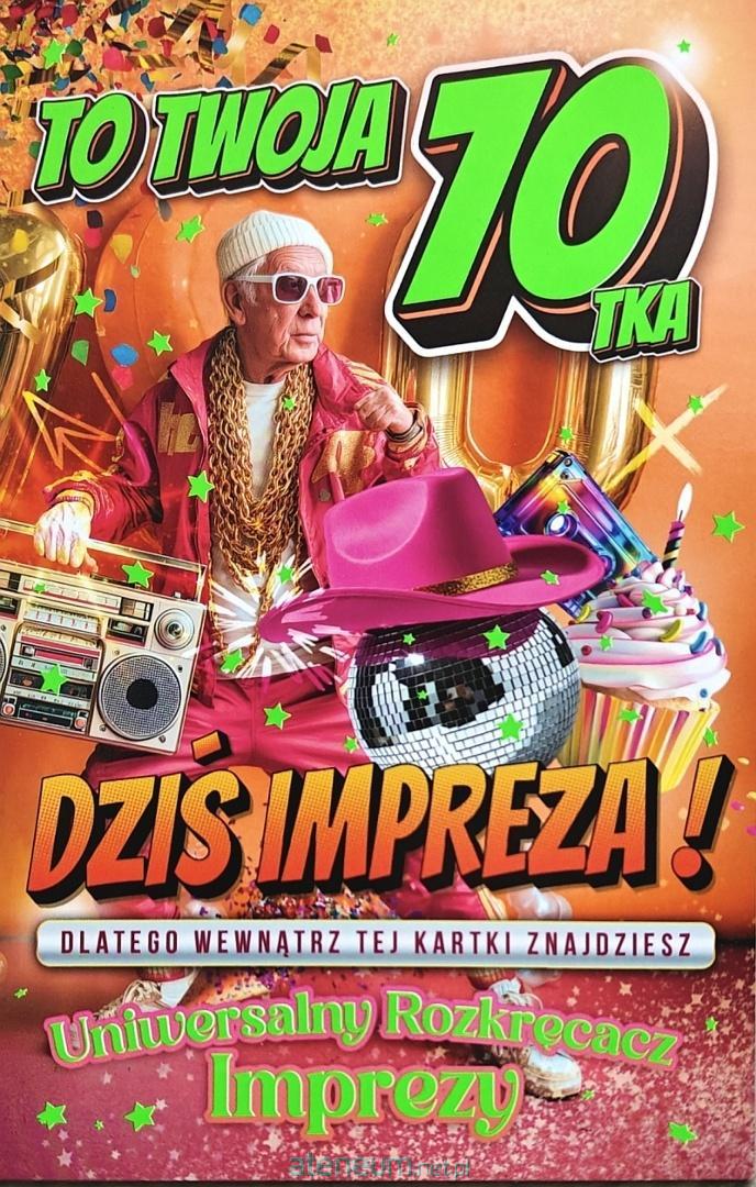 Siedemdziesiątka to doskonały moment, by pokazać wszystkim, kto tu naprawdę rządzi na parkiecie! Szukasz prezentu, który udowodni, że z wiekiem zyskuje się tylko na luzie i ogromnym dystansie do siebie? Ta śmieszna kartka na 70. urodziny to absolutny strzał w dziesiątkę. Z szalonym motywem wyluzowanego faceta, z wielkim boomboxem, grubymi złotymi łańcuchami, kulą disco i hasłem "To Twoja 70-tka. Dziś Impreza!", idealnie sprawdzi się jako upominek dla taty, dziadka, wujka czy przyjaciela z potężną dawką poczucia humoru.