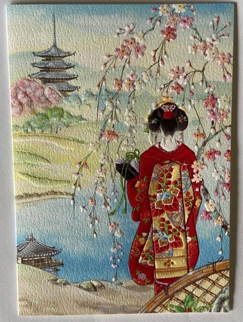 Elegancki japoński karnet premium z piękną, artystyczną ilustracją. Przedstawia młodą kobietę (gejszę/maiko) w bogato zdobionym czerwono-żółtym kimonie z kwiatowymi motywami, stojącą tyłem do widza. Kobieta znajduje się na tle malowniczego japońskiego krajobrazu z kwitnącą wiśnią, pagodą i błękitną wodą. Jej elegancka sylwetka, wyszukana fryzura z czerwonymi ozdobami oraz delikatnie opadające gałęzie sakury tworzą niezwykle poetycką i harmonijną kompozycję.Karnet w zestawie z kopertą, bez tekstu w środku.