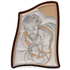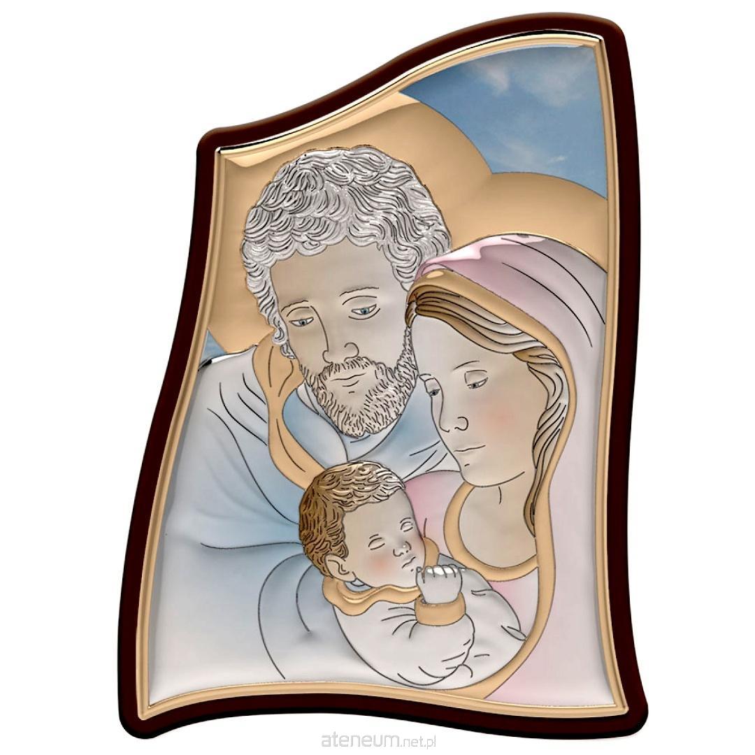 Wizerunek Świętej Rodziny jest przedstawiony w delikatnych kolorach, które harmonijnie łączą się ze srebrnym tłem, nadając scenie głębi i subtelności. Obrazek jest wykonany ze srebra, a jego powierzchnia została częściowo kolorowana, co pięknie podkreśla detale i dodaje mu wyrazistości. Srebrny, kolorowany wizerunek jest umieszczony na solidnej, drewnianej podstawie, co dodaje mu naturalnego uroku i stabilności. Do obrazka dołączona jest również praktyczna podstawka, dzięki której jest on od razu gotowy do postawienia.