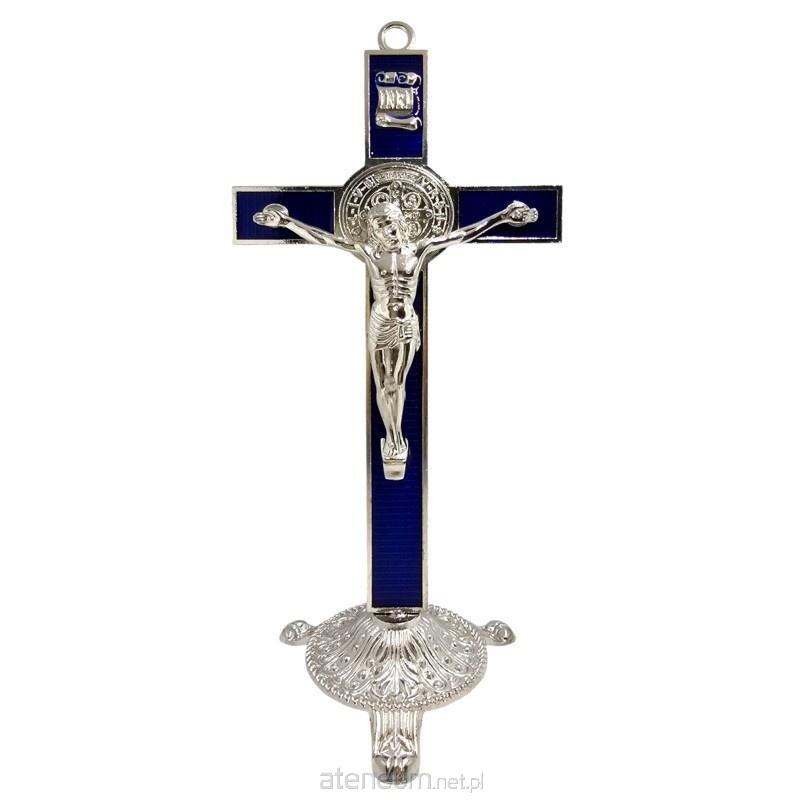 Krzyż ma około 23,5 cm wysokości (z podstawką) i 10,5 cm szerokości, co czyni go dostojnym akcentem w każdym pomieszczeniu. Wykonany z trwałego metalu, wyróżnia się srebrnym kolorem i unikalnym, granatowym wypełnieniem, które nadaje mu wyjątkowego charakteru. To intrygujące połączenie kolorów podkreśla jego formę i symbolikę.