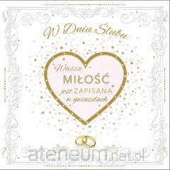 Karnet ślubny z kopertą, złocony, tekst życzeń w środku.