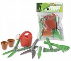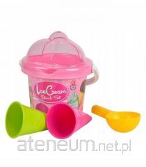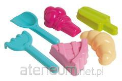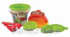 W zestawie: wiaderko, 6 foremek (2 łapki, 2 stópki, głowa pirata, statek), łopatka, grabki, konewka, sitko, które jest pokrywką i uchwytem