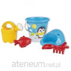 W zestawie: wiaderko, pokrywka pełniąca jednocześnie rolę sitka, żółte grabki i łopatka, foremka w kształcie jednorożca, fioletowa konewka zdobiona brokatem