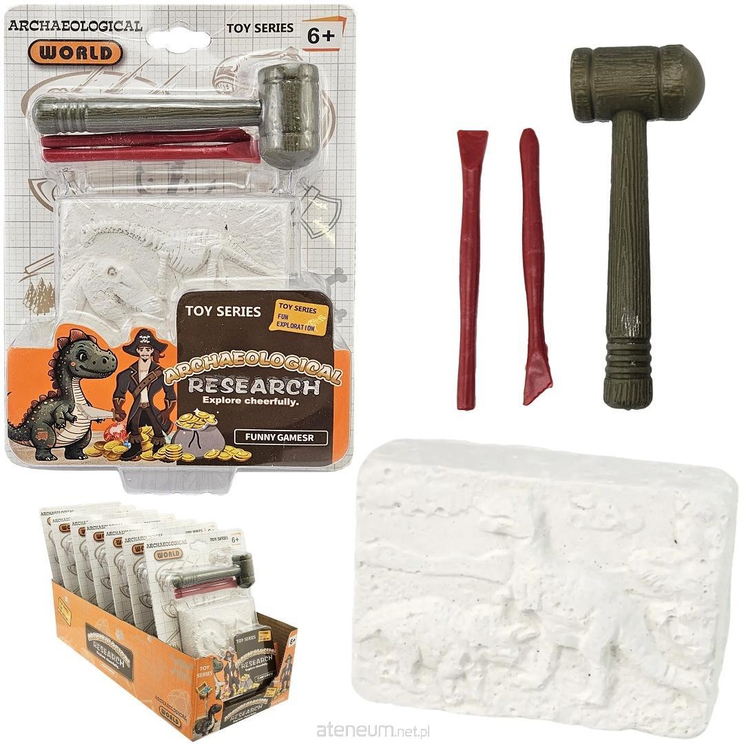 Kompletny zestaw narzędzi: W opakowaniu znajdują się profesjonalne akcesoria niezbędne do pracy badawczej: solidny młotek z teksturą imitującą drewno oraz dwa precyzyjne dłuta ułatwiające kruszenie gipsu i oczyszczanie znaleziska.