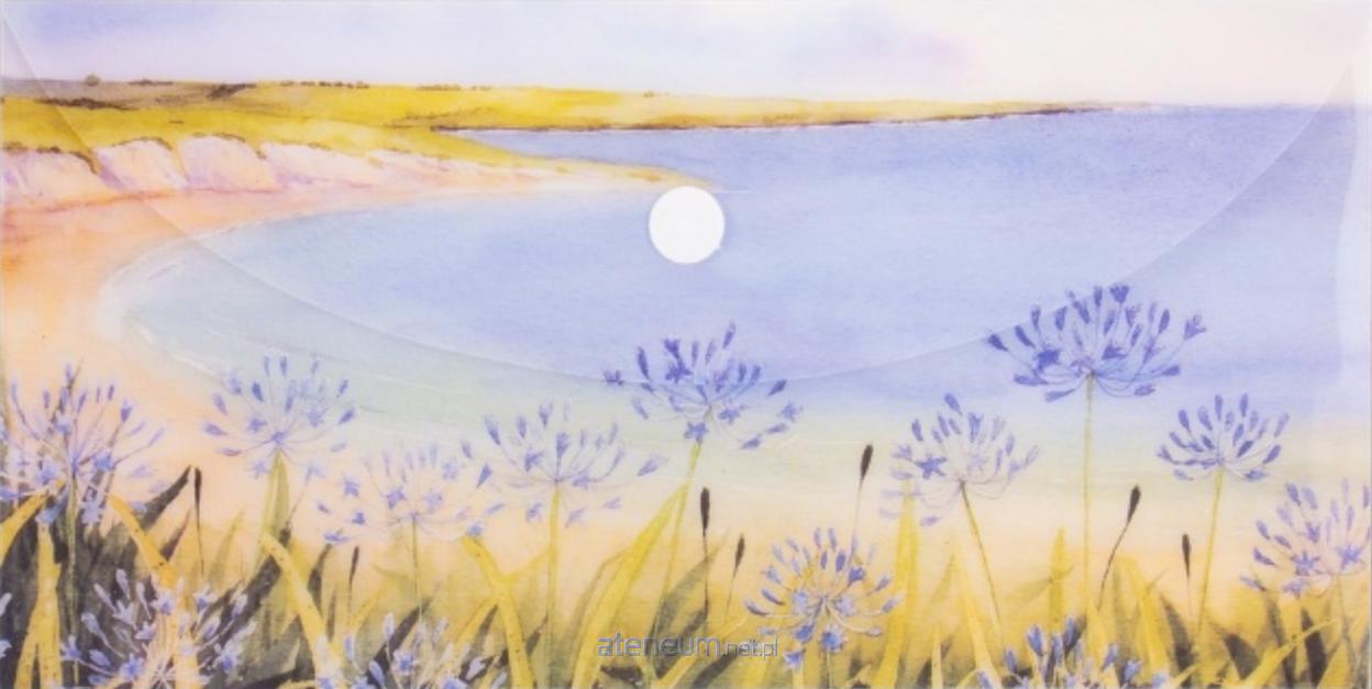 Ozdobna teczka kopertowa VISTA, wykonana z trwałego polipropylenu z nadrukiem przedstawiającym morski pejzaż z niebieskimi kwiatami na pierwszym planie. Zamykana na zatrzask typu napa. Dzięki pełnemu zadrukowi, zawartość teczki pozostaje niewidoczna na zewnątrz. Idealne rozwiązanie do przechowywania dokumentów lub niewielkich płaskich przedmiotów.