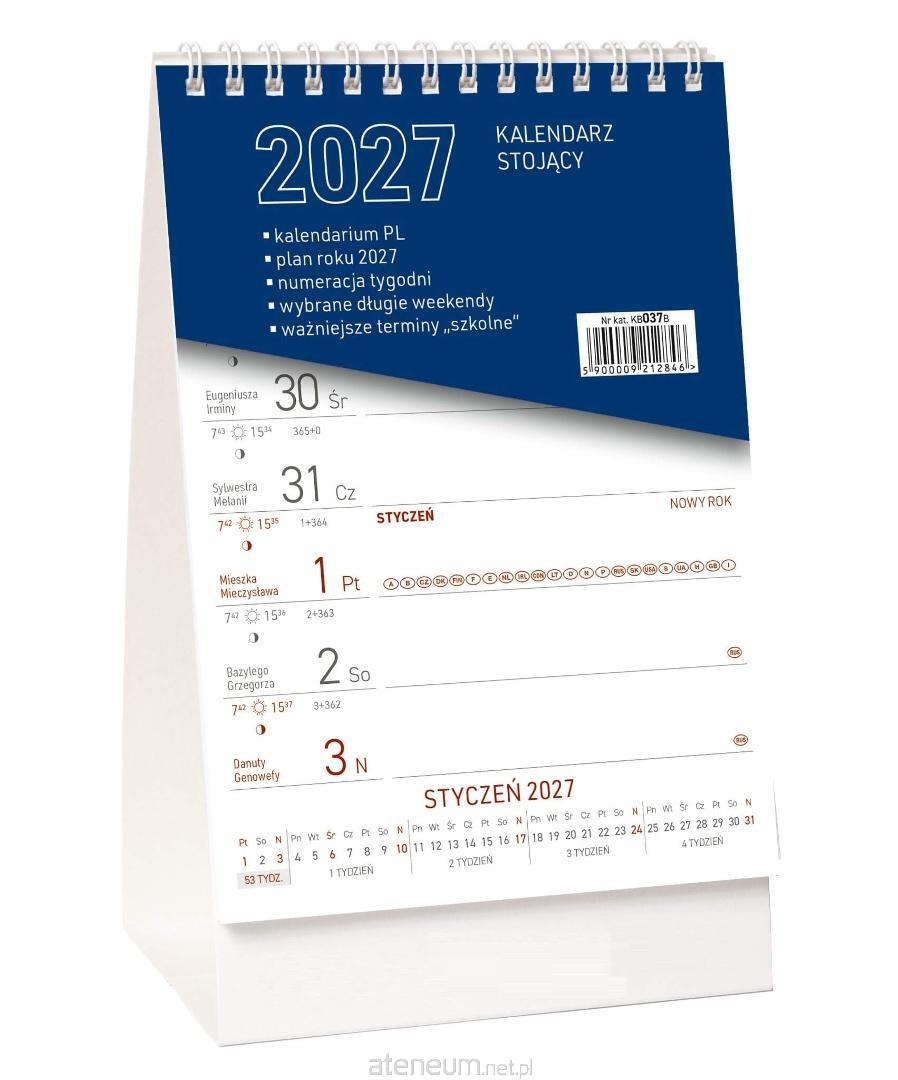 Wygodny kalendarz stojący na biurko z przejrzystym kalendarium w układzie tygodniowym, z dużym obszarem do notowania. W dolnej części kalendarium przegląd aktualnego miesiąca. W dolnej części kartonowej podstawki istnieje możliwość wykonania nadruku reklamowego na obszarze o wymiarach 120 x 20 mm. Istnieje możliwość założenia indywidualnej okładki. W kalendarzu zaznaczone święta i daty imienin.