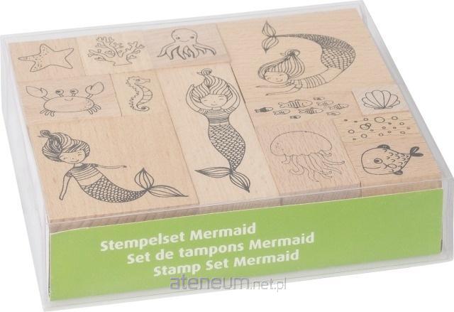 Zestaw 10 drewnianych stempli, każdy z innym motywem.