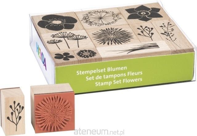 Zestaw 10 drewnianych stempli, każdy z innym motywem.