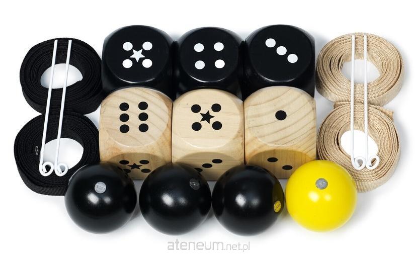 Zawartość: 4 białe metalowe patyczki oraz 4 pasy (2 beżowe i 2 czarne) do znakowania kortów, 3 czarne kostki, 3 naturalne kostki, 3 czarne drewniane kulki, 1 żółta drewniana kulka, torba do przechowywania/transportu, instrukcja.