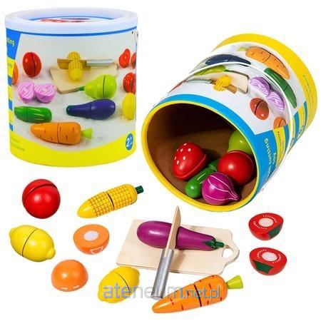 Zestaw składa się z 11 kolorowych warzyw i owoców, które można kroić za pomocą dołączonego noża na specjalnej desce. Elementy zostały połączone rzepami, dzięki czemu dziecko może wielokrotnie je łączyć i rozdzielać, co dodatkowo uatrakcyjnia zabawę. Całość została wykonana z wysokiej jakości drewna, co zapewnia trwałość oraz bezpieczeństwo użytkowania.