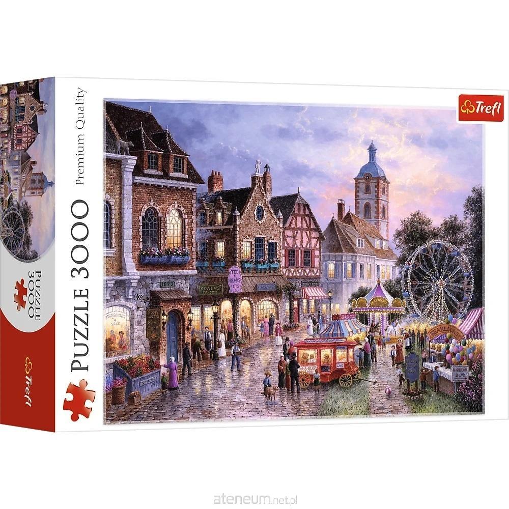 Puzzle 3000 elementów przedstawiające uroczy obrazek wesołego miasteczka z dawnych lat. Po ułożeniu powstanie obrazek o wymiarach 116x85cm. Wysoką jakość, nasycenie kolorów i bezpieczeństwo układania zapewnia wykorzystanie materiałów ekologicznych.