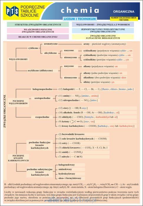 Podręczne Tablice Szkolne - część II - Chemia organiczna dla liceum ogólnokształcącego, liceum profilowanego i technikum Cz. I. Chemia ogólna i nieorganiczna, cz. II. Chemia organiczna Numer zalecenia środka dydaktycznego: MEiN 1967/2006 Podręczne Tablice Szkolne z chemii zawierają podstawowe informacje z zakresu chemii przydatne podczas powtarzania i utrwalania wiedzy na poziomie szkół ponadgimnazjalnych. Rozwijają m.in. takie umiejętności, jak: korzystanie z różnorodnych źródeł informacji, na przykład układu okresowego pierwiastków, literatury popularnonaukowej i Internetu, zapisywanie równań prostych reakcji chemicznych oraz opisywanie efektów energetycznych im towarzyszących, posługiwanie się podstawowym słownictwem chemicznym. W ocenie recenzentów tablice spełniają wszystkie wymagania stawiane środkom dydaktycznym od strony merytorycznej i językowej. Również pod względem jakości technicznej tablice spełniają wymogi dla tego typu środków dydaktycznych, a estetyka nie budzi zastrzeżeń. Recenzenci zgodnie podkreślają, że zastosowanie tego środka dydaktycznego pozwoli na kształcenie kompetencji w zakresie wyszukiwania i przetwarzania informacji. Zawartość tablic: Część I. Chemia ogólna i nieorganiczna Podstawowe pojęcia Prawa chemii Energetyka reakcji chemicznych Kinetyka i równowaga chemiczna Układ okresowy pierwiastków Struktura substancji Roztwory Utleniania i redukcja Elektrochemia Część II. Chemia organiczna Struktura związków organicznych Właściwości fizyczne związków organicznych Reakcje w chemii organicznej Węglowodory - związki węgla z wodorem Jednofunkcyjne i wielofunkcyjne związki organiczne Związki organiczne o znaczeniu biologicznym
