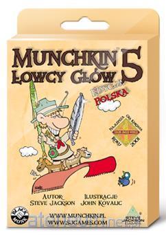 Dodatek zawiera 110 nowych kart do kultowej gry Munchkin, w której zabijasz potwory, zgarniasz skarby i oszukujesz kumpli. Munchkin 5 wprowadza nową Klasę...Łowców! Mogą oni poskramiać Potwory i zamieniać je w Rumaki, dla jeszcze większych bonusów i Poziomów! Ale przede wszystkim Munchkin 5 to jeden z najpotworniejszych dodatków w historii- zawiera mnóstwo bardzo potężnych Potworów i bardzo wartościowych przedmiotów, czyli wszystko to, co Munchkini lubią najbardziej! Tak więc dokręć do swojego Latającego Dywanu wzbudzającą zazdrość u kumpli Indywidualną Tablicę Rejestracyjną, domaluj mu Wyścigowe Paski, przywdziej Talerzykową Zbroję i rusz na krucjatę przeciwko Prorokowi Orki Przymierza, wracającemu z zaświatów Anubisowi i przerażającemu Bazyliszkowi. Wykończ ich, zgarnij ich wypasione Skarby, zyskaj Poziomy i wygraj- bez tego całego durnego odgrywania postaci. Dodatek Munchkin 5 ,,Łowcy Głów" nie jest samodzielną grą! Do gry potrzebna jest Edycja Podstawowa Munchkina!