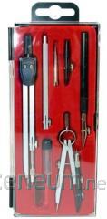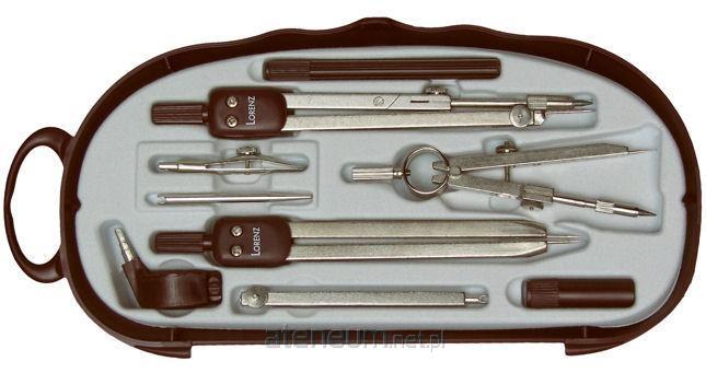 Cyrkiel techniczny typu 200, cyrkiel precyzyjny, cyrkiel "kroczek", ramię przedłużające, zestaw do tuszu,końcówka do rapidografów, końcówka do tuszu, końcówka pomiarowa i zapas grafitów, produkcja LORENZ Włochy. Zestaw 9 elementów zapakowanych w plastikowe pudełko.