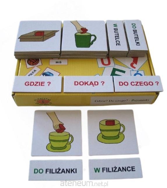 Zestaw ten służy do nauki rozumienia wyrażeń przyimkowych (przyimki do, w ), wykonywania ruchu wkładania do pojemników na podstawie obrazka, rozumienia pytań: Gdzie?(Dokąd?)Do czego? , oraz udzielaniu odpowiedzi obrazkiem, etykietką lub slowem - pokazywaniu zmiany końcówki rzeczownika w zależności od użytego przyimka, czytania globalnego (całymi wyrazami).