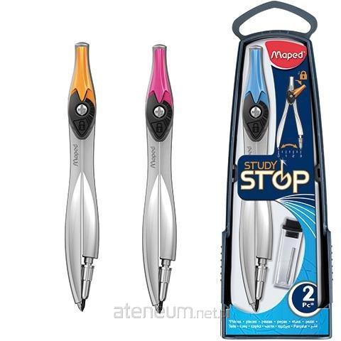 Metalowy cyrkiel STUDY STOP z grafitową końcówką. Grafit 2 mm. Opatentowany system blokady ramion w określonej pozycji. Precyzja bez wysiłku. Ergonomiczny uchwyt w 3 kolorach; żółty, czerwony i niebieski. Pakowane w plastikowe etui. Mix kolorów, kolor wysyłany losowo.