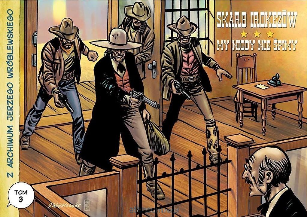 Trzeci tom serii "Z archiwum Jerzego Wróblewskiego" zawiera dwie klasyczne historie westernowe. Pierwsza z nich zatytułowana "Skarb Irokezów" (na podstawie tekstu Andrzeja Białoszyckiego) nawiązuje swoją treścią do przebojowych filmów z lat 60. ubiegłego wieku, w tym szczególnie do westernu "Złoto MacKenny". Komiks był drukowany w 1976 r. na łamach "Dziennika Wieczornego". W 1990 r. był planowany jego przedruk w drugim - po "Leworękim" - tomie, jaki miało przygotować wydawnictwo "Hulak, Chudzinski i synowie". Jednak ostatecznie album zatytułowany "Powrót Baxtera" nigdy się nie ukazał. "My nigdy nie śpimy" (na podstawie scenariusza Andrzeja Janickiego) to natomiast komiks premierowy. Ostatni, nad którym pracował Jerzy Wróblewski i którego rysowanie przerwała przedwczesna śmierć artysty. Komiks ten miał być częścią gazety komiksowej, którą planowali tworzyć na początku lat 90. bydgoscy autorzy komiksów. - Chcieliśmy zaangażować do tego pomysłu, tych polskich rysowników, których wówczas znaliśmy. Ja zebrałem jakieś materiały o Agencji Pinkertona i to zainspirowało mnie do napisania scenariusza, specjalnie dla Jerzego Wróblewskiego. Poszedłem z tym do niego, żeby przekonać go, do tego projektu. Zgodził się na współpracę bez szczególnych zastrzeżeń. Namawiałem go, żeby zrobić ten komiks bardziej w stylu spaghetti-westernów - czyli długie płaszcze, brudne stroje i zarośnięte twarze, bez białych koszul, dopasowanych, czarnych kamizelek i ślicznych kapeluszy. Zgodził się na taką wizję bez wahania - wspomina Janicki.