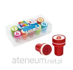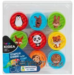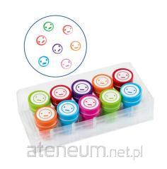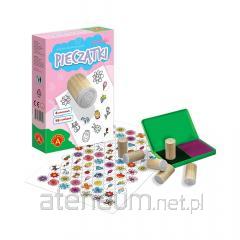 Zestaw kreatywny dla dzieci składający się z 6 pieczątek z wzorami zwierzątek (kotek, piesek, myszka, świnka, tygrysek, krówka), które można odbijać na kartce czarnym i czerwonym tuszem z poduszek znajdujących się w specjalnym, plastikowym pudełku. Odbite kształty można kolorować kredkami lub dodatkowo ozdabiać nimi swoje rysunki. 135 kolorowych naklejek urozmaica zabawę. Wszystkie elementy znajdują się w eleganckiej, funkcjonalnej wyprasce.