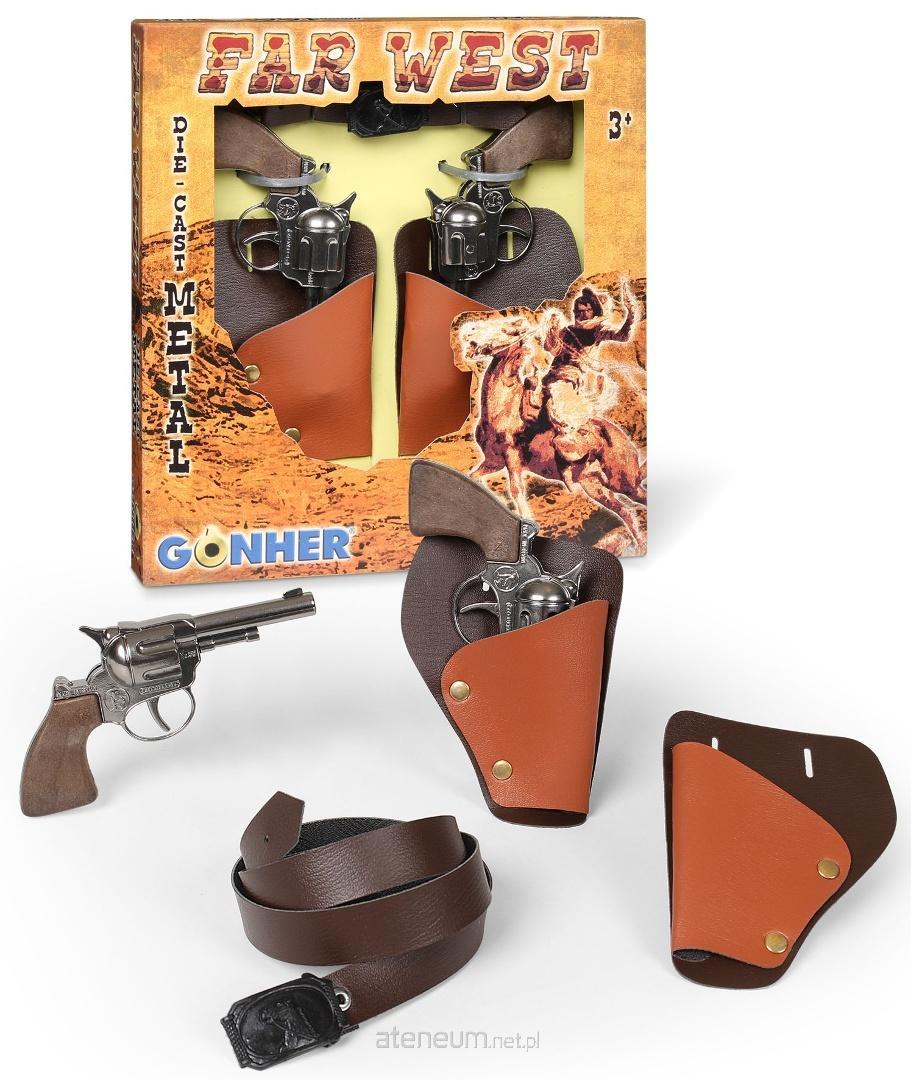 Dwa metalowe rewolwery kowbojskie w zestawie z kaburą. Rewolwer nie strzela nabojami, wydaje jedynie dźwięk.