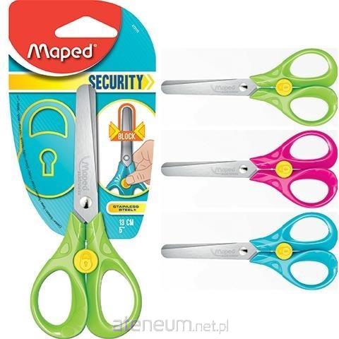 Nożyczki SECURITY z unikalnym systemem blokady ostrzy zwiekszającym bezpieczeństwo użytkowania. Ergonomiczne uchwyty 3D w trzech kolorach. Długość 13 cm. Blister.