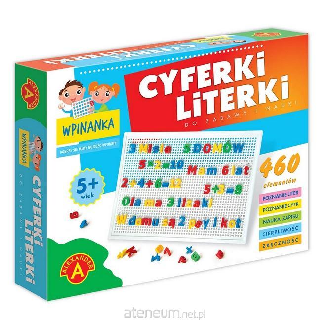 Zabawka składa się z perforowanej tablicy, zbioru dużych i małych literek oraz z zestawu cyferek.