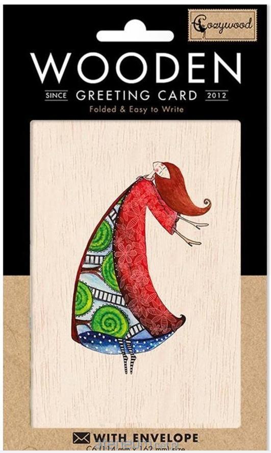 Karnet drewniany C6 + koperta Kobieta z dmuchawcem