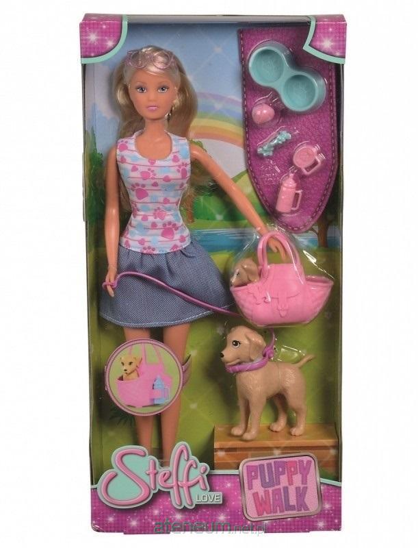 Lalka Steffi na spacerze z psamiSteffi na spacerze z suczką i szczeniaczkiem w stylowej torbie. Ubrana w sportową sukienkę i traperki. Zestaw zawiera akcesoria dla piesków.