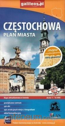 Plan Częstochowy w skali 1:16 000 Na pierwszej stronie znajduje się plan Częstochowy z powiększonym centrum w skali 1:10 000. Treść mapy zawiera wszelkie niezbędne dla turysty informacje: lokalizację noclegów, restauracji, obiektów kultury, przebieg szlaków turystycznych. Została również naniesiona komunikacja autobusowa i tramwajowa. Na mapie wkreślono współrzędne geograficzne zgodne z GPS. Na drugiej stronie znajduje się, bogato zilustrowany fotografiami, opis najważniejszych obiektów w podziale na dzielnice. Umieszczono tam także plan zespołu klasztornego na Jasnej Górze i spis ulic. Ta mapa jest wydrukowana na specjalnym materiale. Odpornym na przetarcia - rozdarcia oraz na wilgoć, deszcz, ulewę, grad. Nie wymaga stosowania mapnika. Idealna na każde warunki pogodowe. Po zabrudzeniu jej można ją umyć w wodzie. Może tez służyć jako peleryna od deszczu ? STUDIO PLAN gwarantuje 100% wodoodporność.