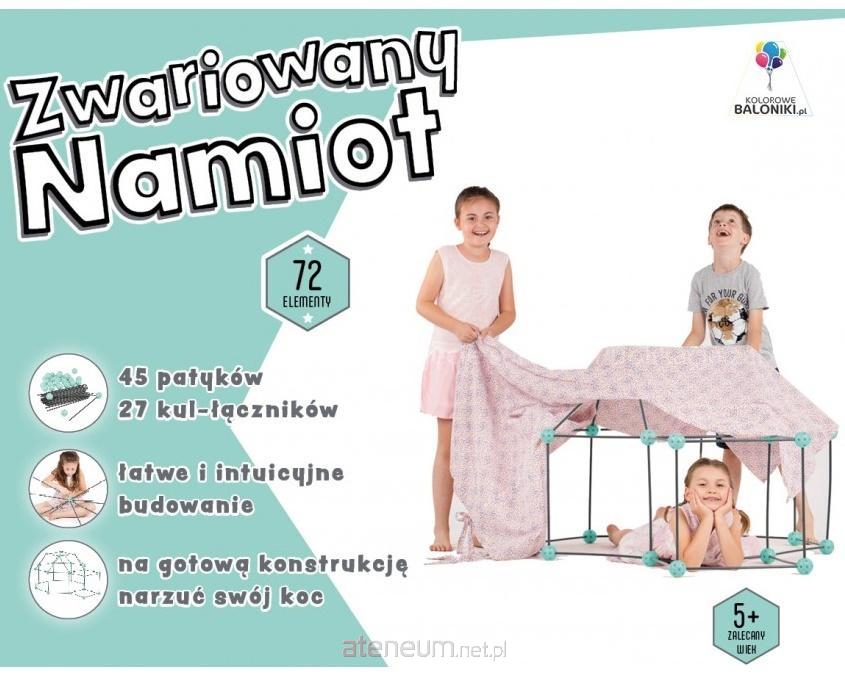 Zwariowany Namiot: zestaw kulek i patyków, które w łatwy sposób łączą się, by budować duże, przestrzenne konstrukcje; rozwija umiejętności planowania, wizualno-przestrzenne, kreatywności, wyobraźnię, aby ożywić budowlę wystarczy narzucić koc; zawiera 27 geometrycznie precyzyjnych kul i 45 patyków zestaw nie zawiera koca; elementy łatwo się łączy i rozkłada; kolor zielono - szary zestawu dla dzieci w wieku 5+