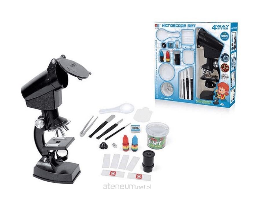 Zostań małym naukowcem! Wyobraź sobie tylko jakie wspaniałe rzeczy odkryjesz za pomocą mikroskopu. Jak wygląda w powiększeniu owad, piórko, obrazek w gazecie, liść, Twój palec, włos albo kryształki soli? Z mikroskopem codzienne przedmioty, odsłonią swe mikrotajemnice oraz odkryją niesamowite obrazy, dotychczas nieosiągalne dla oka. Rewelacyjny zestaw z akcesoriami wprowadzi Cię we wspaniały świat mikrobiologii, nauki i przyrody. Mikroskop posiada wszystko byś mógł rozpocząć przygodę z nauką przez zabawę: regulowaną wysokość obiektywu; obrotowy obiektyw z soczewkami dającymi powiększenie 300x/600x/1200x; platformę na oglądane obiekty; regulację odległości; możliwość zrzucenia oglądanych obrazów na ścianę lub inne podłoże, podstawę; akcesoria. Zabawka rozwija zdolności poznawcze dziecka, ciekawość oraz wprowadza je w fascynujący świat nauki. Niezastąpiona pomoc naukowa dla małego ucznia. Zestaw zawiera: mikroskop, projektor, skalpel, łopatkę, igłę, pojemnik na badane obiekty, lupę, 2 buteleczki, pęsetę, 4 szkiełka, 2 szkiełka z gotowym materiałem, osłonę obiektywu kondensatora, okular, instrukcję.