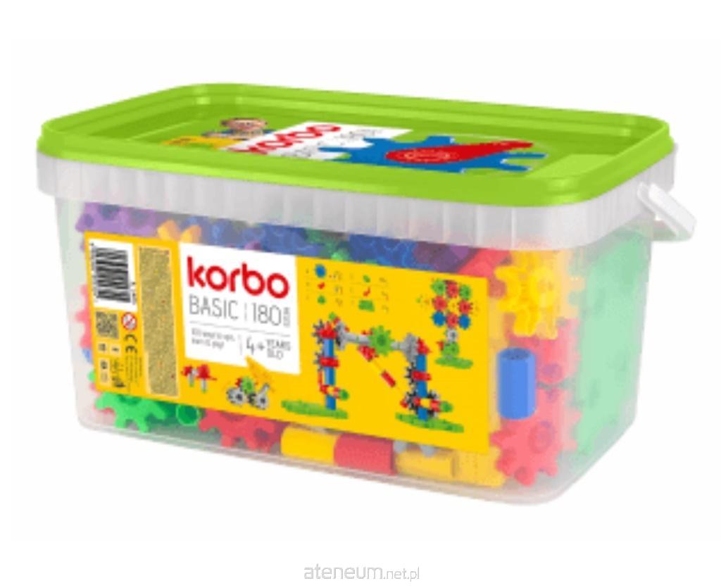 Korbo Basic 180 to największy z zestawów Basic. W skład zestawu wchodzą aż 72 koła zębate oraz 8 podstaw. Różnorodność i uniwersalność klocków w tym zestawie pozwala na tworzenie dowolnych konstrukcji. W dołączonej instrukcji znajdziemy 15 pomysłów na zbudowanie różnych konstrukcji o różnych stopniach trudności, na przykład żyrafę, kaczkę czy stonogę albo robota, latarnię wodną czy gazociąg. Zestaw Korbo Basic 180 posiada osiem plansz w dwóch kolorach do tworzenia ciekawych konstrukcji na platformach, więcej elementów dających większe możliwości tworzenia i budowania, piękną kolorystykę pobudzającą dziecięcą wyobraźnię oraz daje możliwość poznawania fizyki i mechaniki przez świetną zabawę.