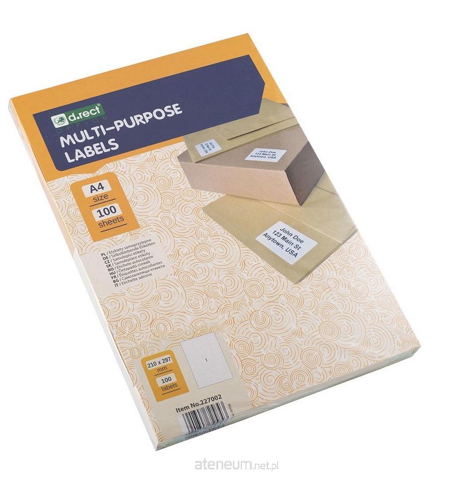 Opis produktu: Etykiety samoprzylepne przeznaczone do adresowania kopert i przesyłek pocztowych, oznaczania i organizowania dokumentów i wielu innych zastosowań. Odpowiednie dla wszystkich typów drukarek atramentowych, laserowych oraz kserokopiarek. Zapewniają znakomite przyleganie do powierzchni. - rozmiar etykiety: 210 x 297 mm - liczba etykiet na arkuszu: 1 - ilość arkuszy: 100