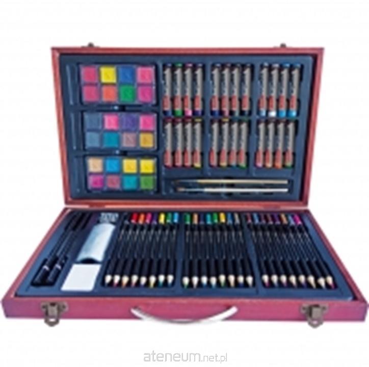 Zestaw artystycznyto doskonały początek przygody młodego artysty. Komplet jest funkcjonalny i składa się łącznie z87 praktycznych elementów.Mnogość przyborów sprawi, że każde użyciezestawu artystycznego będzie doskonałą podróżą w świat sztuki.W skład zestawu wchodzą 24 kredki, 24 pastele olejne, 24 kolory farbki akwarelowej, 3 paletki, 2 ołówki HB, 2 pędzelki, 6 papierów ściernych, temperówka, gumka . Wykonane z najwyższej jakości materiałów przybory mają szeroką gamę kolorystyczną, co dodatkowo ułatwi wykonywanie prac plastycznych czy codzienny użytek. Całość została umieszczona w eleganckiej i praktycznej walizce, ułatwiającej przenoszenie i dodatkowo podbijającej walory estetyczne całego zestawu. Zestaw do malowania i rysowania to nie tylko obowiązkowy element wyposażenia każdego ucznia czy miłośnika kreatywnych zadań, ale także doskonały pomysł na prezent. Parametry: - 87 elementów - 24 kredki - 24 pastele olejne - 24 kolory farbki akwarelowej - 3 paletki - 2 ołówki HB - 2 pędzelki - 6 papierów ściernych - temperówka - gumka