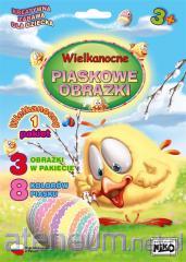 Piaskowe obrazki pakiet nr 2 to kreatywna zabawa dla dzieci, polegająca na tworzeniu barwnych ilustracji z piasku. Zestaw zawiera trzy obrazki: zajączek, kogutek, kwiaty w pisance; 8 woreczków z kolorowym piaskiem oraz patyczek, za pomocą którego odkrywamy klejącą warstwę ilustracji. Przy tej zabawie wyobraźnia nie zna granic! OPAKOWANIE FOLIA CPP